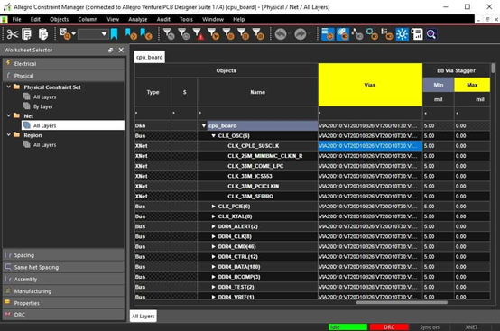 我們已經看到了使用約束管理器為跟蹤路由設置設計規則的重要性。在對混合信號設計進行布線時,這對于標準布線、差分對、阻抗控制走線、不同模擬信號以及電源和接地走線所需的所有不同走線寬度都有很大幫助。但是跟蹤路由規則并不是 Cadence 的約束管理器控制的唯一規則。它還將控制組件間隙、通孔類型、測試約束,甚至是信號完整性和時序等電氣屬性。