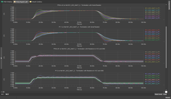 在布局階段要在 PCB仿真中檢查的其他一些重要仿真指標(biāo)是反射和串?dāng)_。這兩者都可以使用 PCB 編輯器中的輕量級 2D 求解器進(jìn)行評估,結(jié)果可以在時(shí)域中的圖形上進(jìn)行可視化。這些功能非常適合快速識別關(guān)鍵網(wǎng)絡(luò)上的干擾(串?dāng)_模擬)或快速確定互連中的端接需求。也出現(xiàn)在 PCB布局仿真中的 SPICE 的一項(xiàng)重要功能是能夠使用參數(shù)掃描來迭代可能的終端值。這些結(jié)果可以顯示在一系列重疊曲線上以進(jìn)行比較。