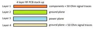 射頻板堆疊需要仔細注意組件和走線之間的隔離、電源去耦、層數、排列和放置等細節。下圖顯示了標準的4層射頻疊層。